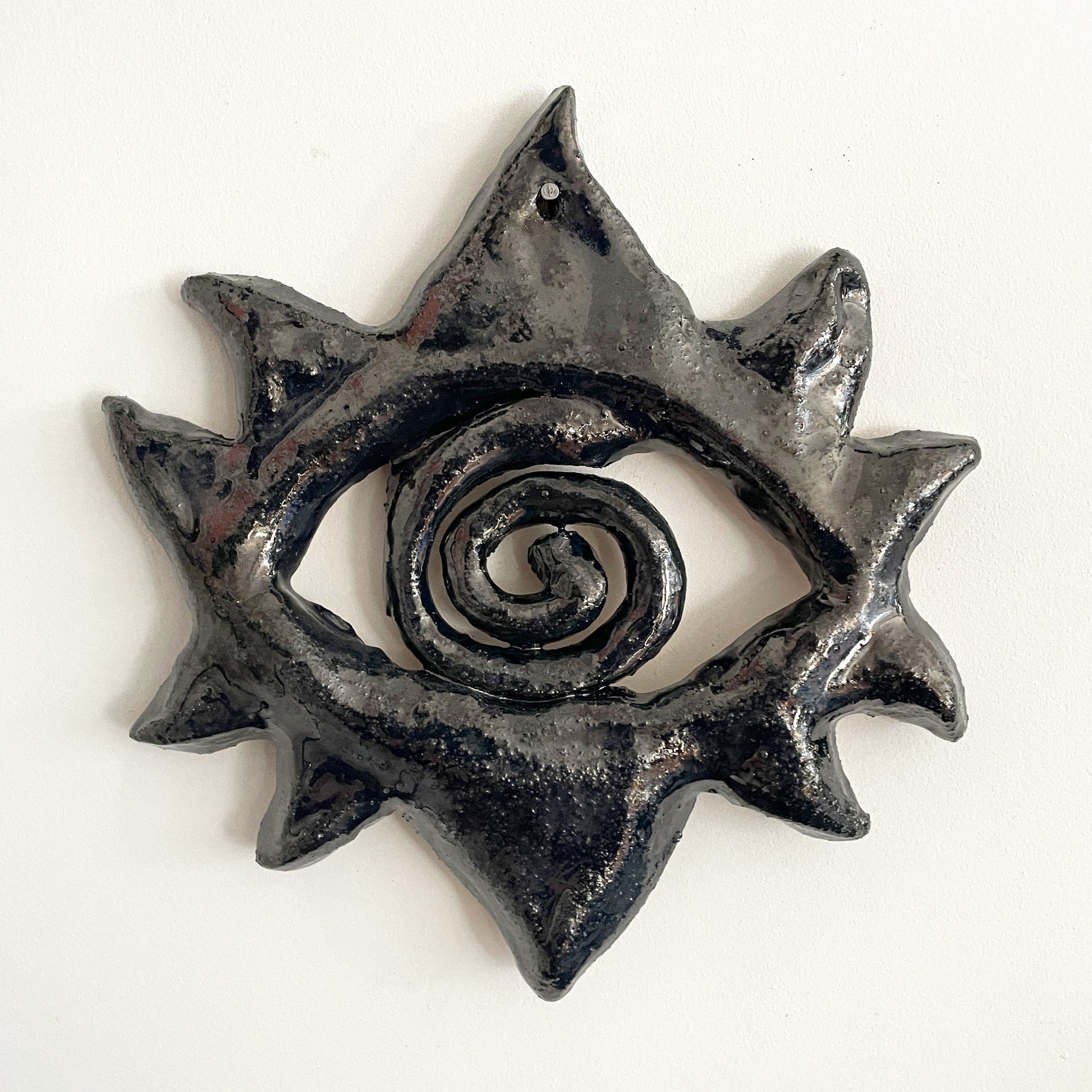 One of a kind ceramic sun/eye/spiral wall hanging. Handmade from clay and glazed in dark metallic silver. Designed to hang on a small nail in the wall, or it could be hung in a window. Approx. 7"x7".