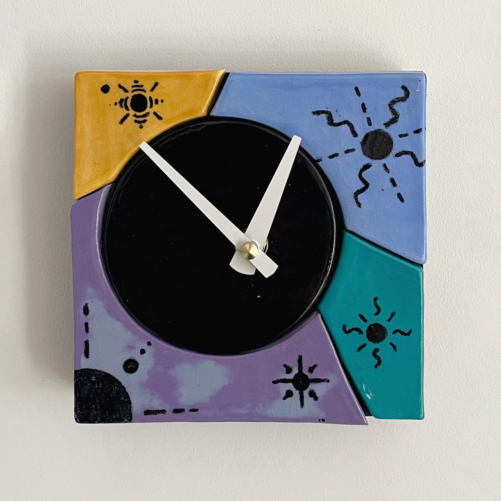 Each clock features ceramic tiles mounted on a wooden back with a battery-powered clock mechanism. Ceramic tiles are all individually handmade, hand-painted and/or screen printed, and assembled in our home studio. Signed and numbered.